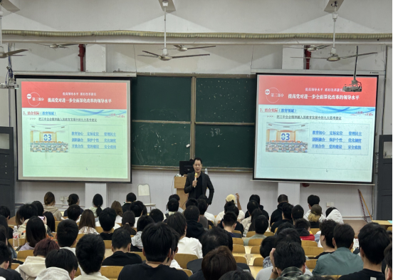 11月1日,通信工程与工业互联网学院陶鸿书记以“学习领会党的二十届三中全会精神”为题,紧紧围绕进一步全面深化改革、推进中国式现代化,深入阐述全面深化改革的重大意义和必要性,为学院学生代表解读党的二十届三中全会的精神要义和实践要求。他讲到,各位同学要深刻理解把握党的二十届三中全会的重大意义、深入学习领会习近平总书记在党的二十届三中全会上的重要讲话精神、全面准确理解《中共中央关于进一步全面深化改革、推进中国式现代化的决定》提出的重大改革举措;要求学生切实把学习的过程转化为增强理论功底的过程,把思考的过程转化为将中央精神和思想实际相结合的过程,为推动专业发展和科技创新贡献青年智慧,更要把个人理想追求融入党和国家事业当中,跑好实现中华民族伟大复兴的这场“接力跑”,让人生之路在信仰之光的照耀下行稳致远;要求学生党员要以“坚定理想信念,汲取奋进力量”的追求,常补精神之“钙”、勤吸理论之“氧”,结合学习工作实际,坚定不移地学习领会党的二十届三中全会精神;要求全体学生以“肩负使命担当,践行奉献精神”的作为,常思职责之重、常念使命之要,秉持解放思想、实事求是的态度,勇于开拓、敢于尝试,矢志不渝地践行党的二十届三中全会部署;在全面深化改革的新征程上,以敏锐之思洞察时代变革,以果敢之行投身改革浪潮,与时代齐发展、与祖国共奋进。